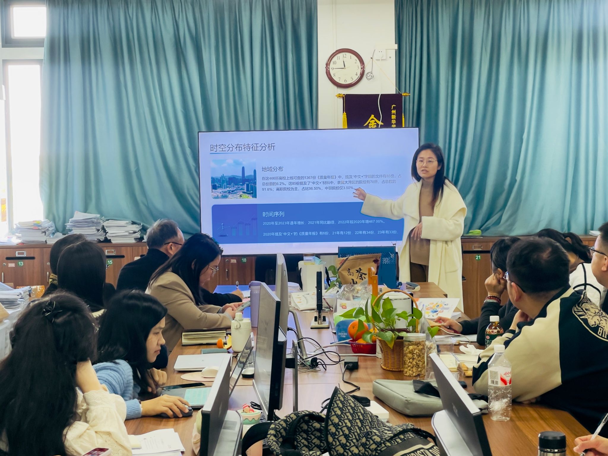 沙龙在简要的开场介绍中拉开帷幕。郑秋晨老师以《大湾区“中文+职业技能”语言服务调查》为题,展示了职业教育与中文国际推广交叉领域的生动图景。通过对广东省数百所职业院校历年质量报告的系统梳理,郑老师勾勒出“中文+职业技能”项目在大湾区的发展轨迹:2020年以来,相关项目数量增长显著,且以公办高职院校为主要推动力量,覆盖了从装备制造、财经贸易到电子信息、交通运输乃至粤菜烹饪等多个特色领域。然而调查也揭示出一些现实问题,例如项目多集中于“一带一路”沿线亚洲与非洲国家,欧美等地几乎空白;授课语言存在全英、全中、双语等不同模式,但中文与技能培训在部分项目中仍显割裂;个别院校对“中文+”的内涵理解仍存偏差。对此,郑老师提出应明确标准、推动师资融合、借助企业渠道开拓更多区域市场,真正实现“中文借技出海”。